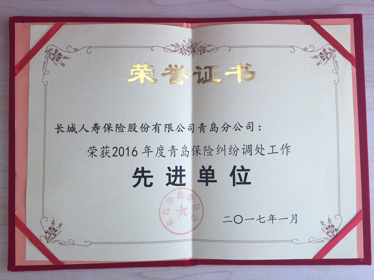 在2016年度青島市保險(xiǎn)糾紛調(diào)處工作中,長(zhǎng)城人壽青島分公司被青島市仲裁委員會(huì)評(píng)選為“先進(jìn)單位”,運(yùn)營(yíng)服務(wù)部經(jīng)理胡立群同時(shí)榮獲“先進(jìn)個(gè)人”榮譽(yù)稱號(hào)。