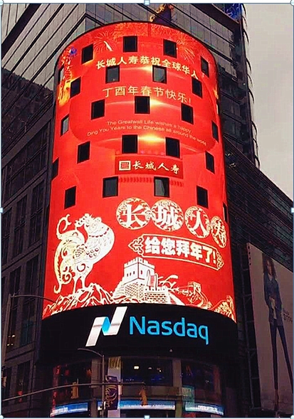 今日,長城人壽精彩亮相紐約時代廣場納斯達克大廈大屏,向全球大聲承諾“有長城,更保險”!長城人壽向全球華人拜年!